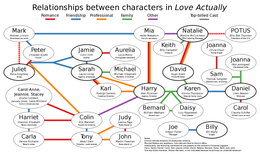 What you have just read is most, but not all, of the relationships in Love Actually. Here is a visual representation of them and the others, and how they all fit together courtesy of Wikipedia:
